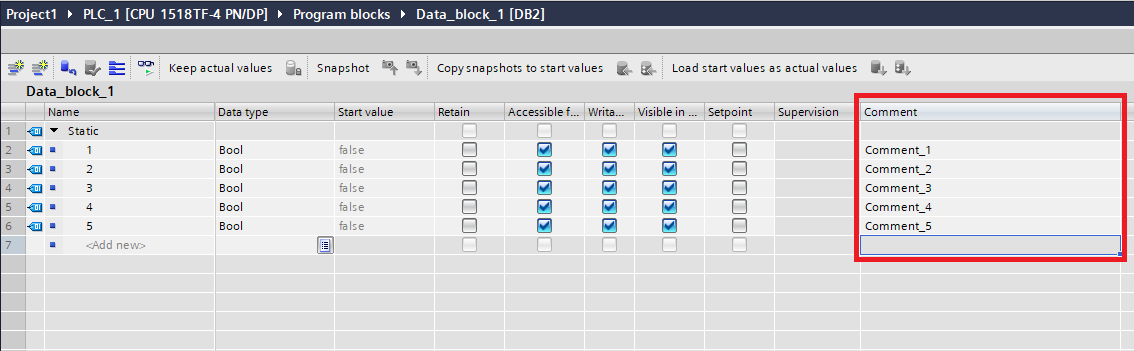 안녕하세요 오늘은 TIA Portal에서 태그의 코멘트를 설정하는 방법을 알아보겠습니다. 이 코멘트는 주로 LAD 프로그래밍 방식에서 사용되는데요. 보통 태그명을 코멘트처럼 이용할 수도 있지만 태그명이 너무 길어질 수 있습니다. 이때 태그명은 간결하게 작성한 후 코멘트를 이용해 부가설명을 적어놓으면 프로그램 가독성이 좋아지는 장점이 있습니다. 먼저 테스트 할 태그를 만들어 보겠습니다. 글로벌 DB를 새로 생성 후 태그를 5개 만들었습니다.그리고 우측 코멘트 란에도 임의로 글자를 적어놓았습니다. 그 다음 FB를 하나 만들어서 간단한 레더 프로그램을 만들어 줍니다. 위 프로그램을 보면 태그명만 나오고 코멘트는 보이지 않습니다. 코멘트를 띄우려면 두가지 방법이 있습니다.첫번째는 프로그램 블록 상단의 설정을 변..