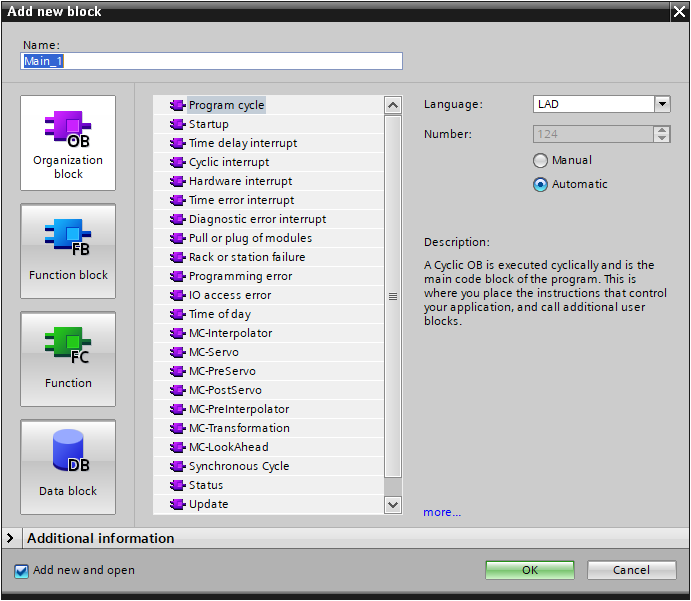 안녕하세요 오늘은 자주 사용하는 OB 종류에 대해 알아보겠습니다. 보시면 OB에도 종류가 여러가지가 있는데요 하나씩 살펴보겠습니다. OB1가장 기본이 되는 OB입니다. TIA Portal에서 CPU를 추가하게 되면 자동으로 생성이 됩니다.대부분의 프로그램 블록들은 OB1에 호출해서 사용합니다. OB100 ~ OB102Startup OB 입니다. PLC 전원이 들어온 후 1회만 실행됩니다.(OB1이 실행되기 전) OB20 ~ OB23Time delay interrupt입니다. 설정된 시간 이후부터 스캔을 시작하게끔 하는 OB인데요.이 OB는 프로그램을 만들어 준 후 사용해야 하기 때문에 다음에 다루도록 하겠습니다.(SRT_DINT라는 펑션을 사용합니다) OB30 ~ 38Cyclic interrupt입니다..